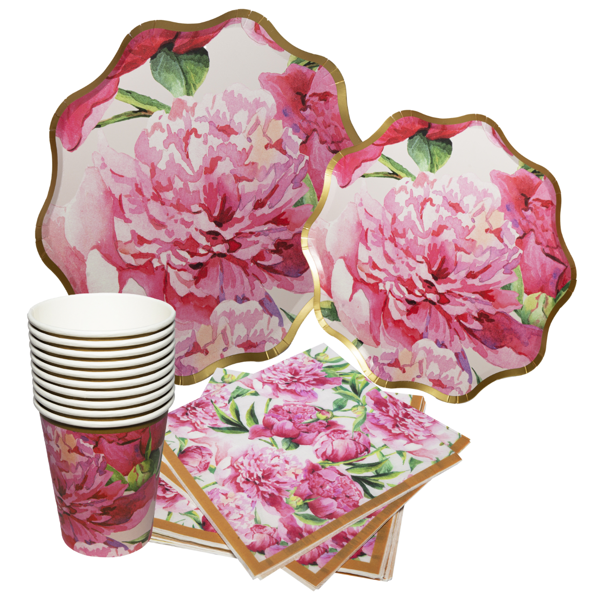 Este set de desechables de carton con diseño de flores de peonías es una opción encantadora y romántica que aporta un toque fresco y vibrante a cualquier evento.