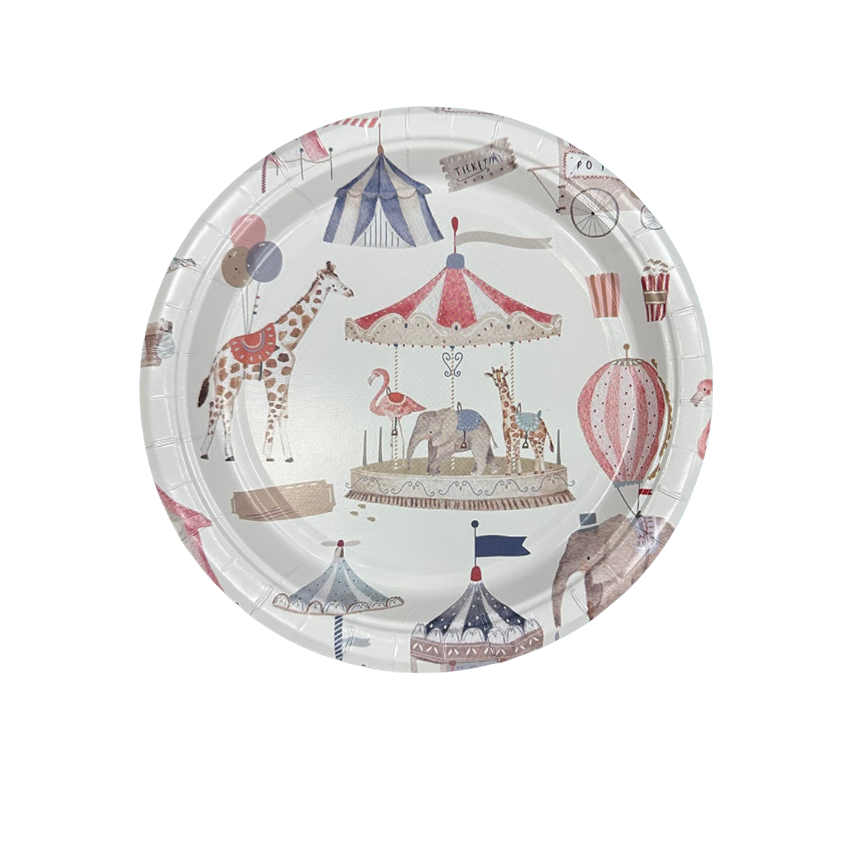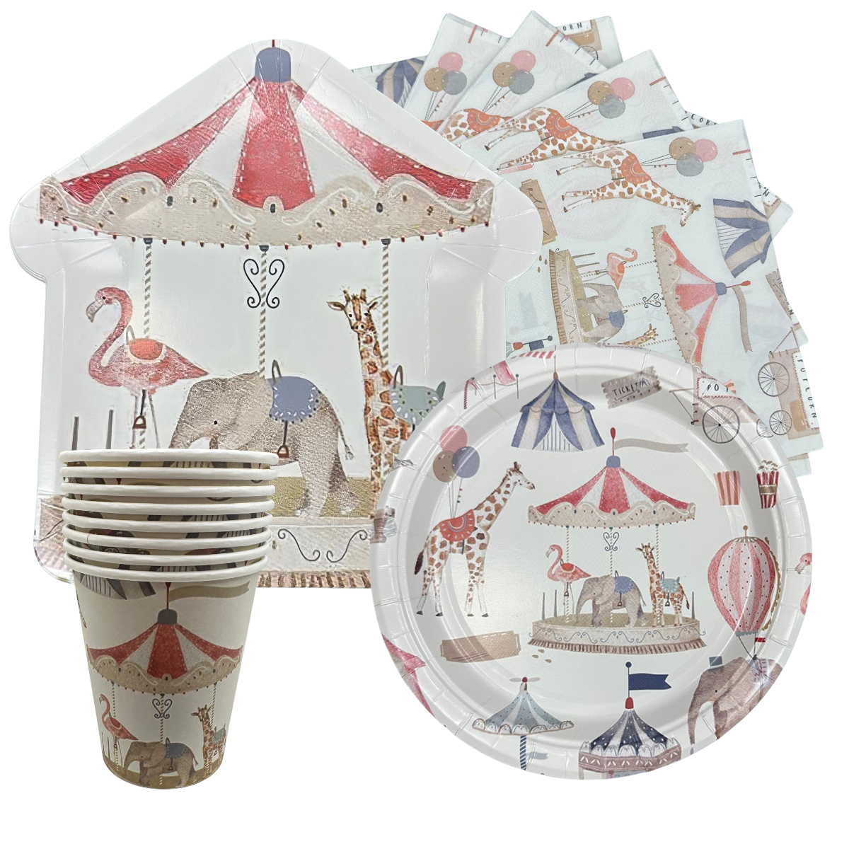 Set desechable Circo Encantado para 8 personas, con un diseño infantil lleno de color y ternura inspirado en el circo, con animales, carruseles y globos. Incluye 8 platos grandes, 8 platos chicos, 8 vasos y 16 servilletas, ideal para cumpleaños y celebraciones infantiles. Divertido, práctico y perfecto para una mesa mágica que encanta a los más chicos.