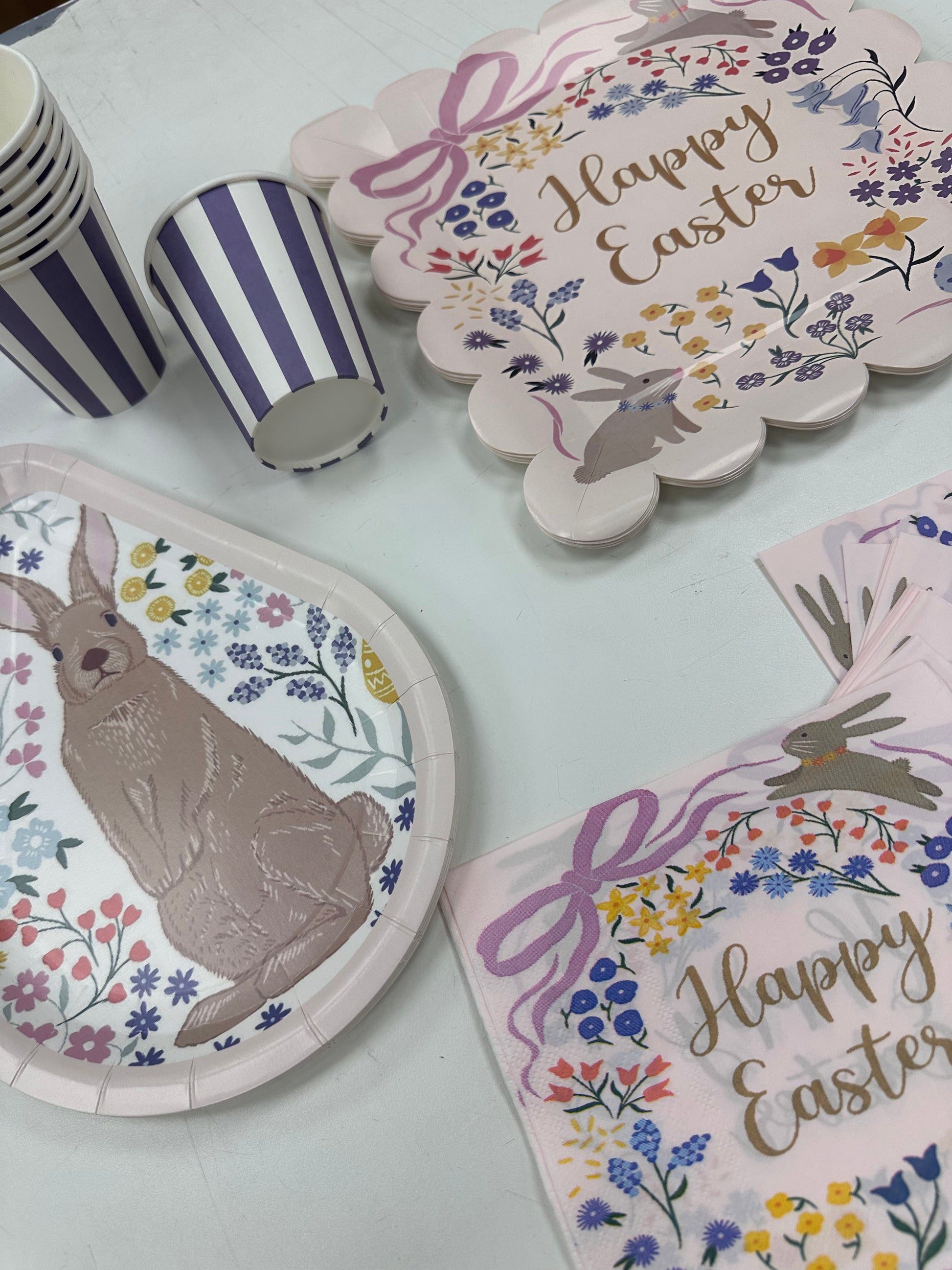 Set desechable Happy Easter para 8 personas, con un delicado y alegre diseño de Pascua en tonos suaves, flores, lazos y conejitos. Incluye 8 platos grandes, 8 platos chicos, 8 vasos y 16 servilletas, ideal para celebraciones de Pascua, brunchs y reuniones familiares. Tierno, práctico y perfecto para una mesa llena de color y encanto